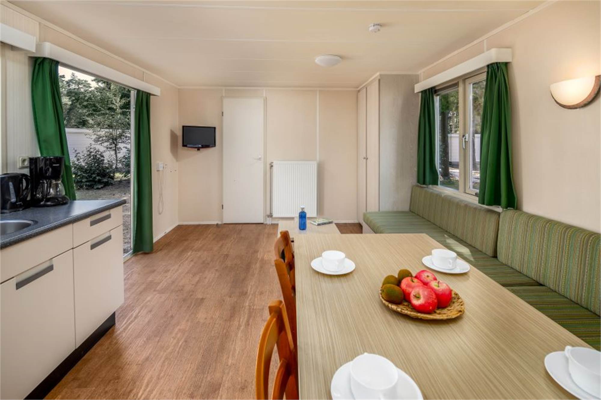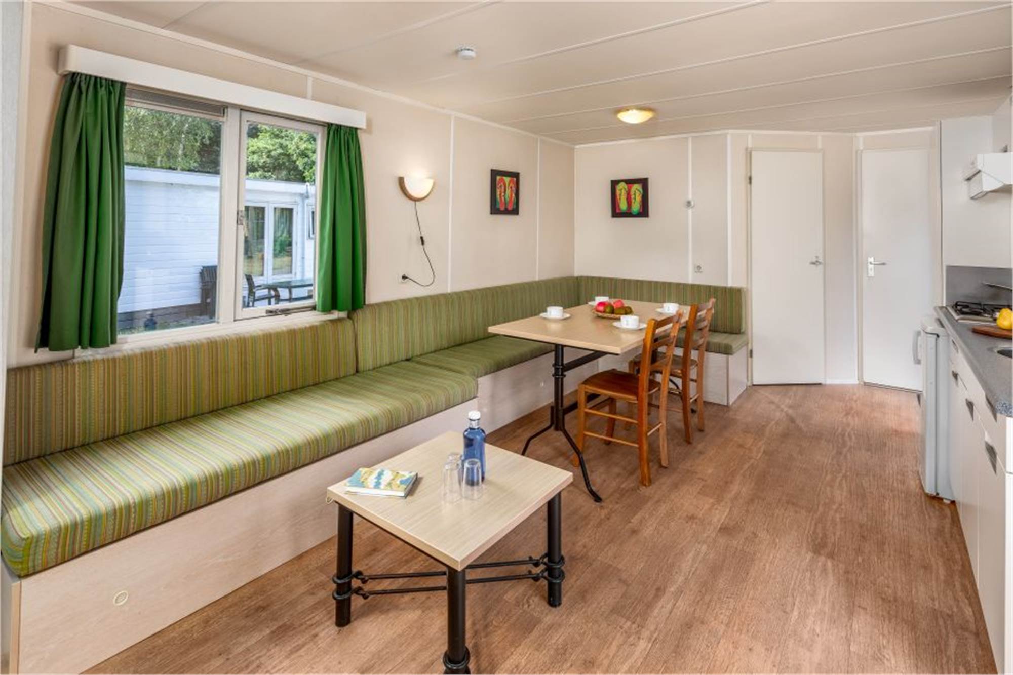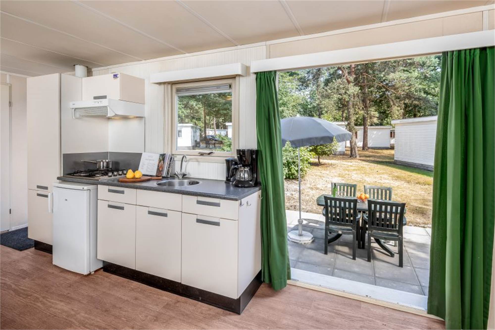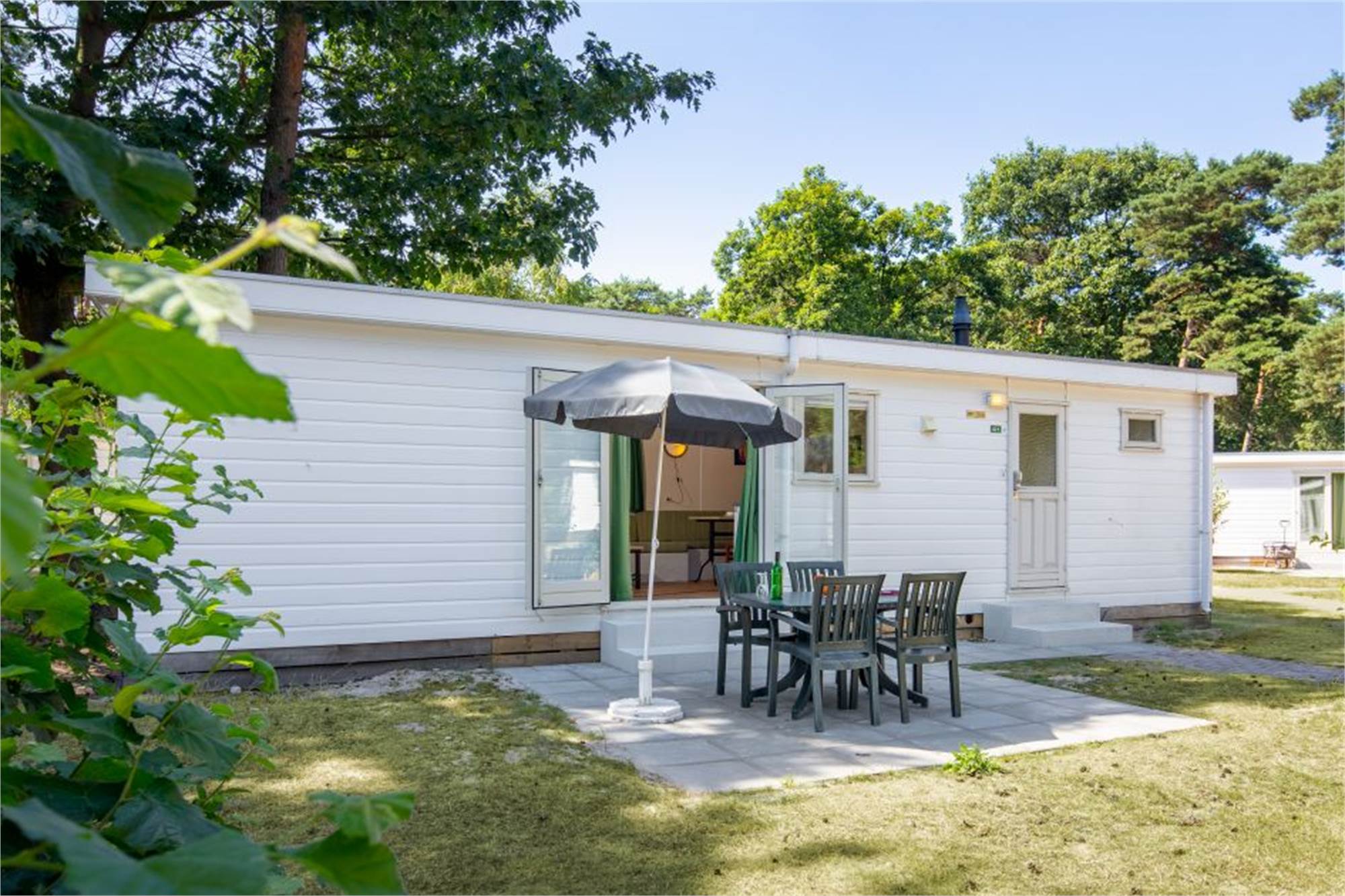 Ce chalet indépendant peut accueillir 4 personnes. Il y a une salle de séjour avec un coin salle à manger et une cuisine ouverte. Il y a 2 chambres et la salle de bains est pourvue d’une douche, d’un lavabo et de toilettes. Chaque chalet dispose d'une véranda en bois ou d'une terrasse en pierre avec mobilier de jardin.